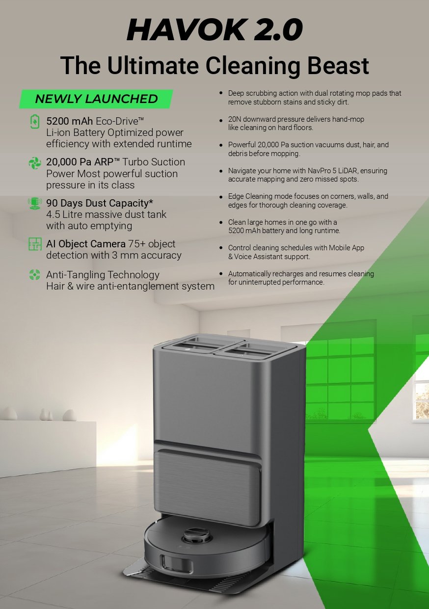 Meet the Future of Cleaning – Havok 2.0. The next‑generation robotic cleaner engineered for powerful, efficient, and truly intelligent home maintenance. Designed for Indian homes and lifestyles, Havok 2.0 combines advanced technology, robust performance, and effortless convenience — all at a price that redefines expectations in its segment.