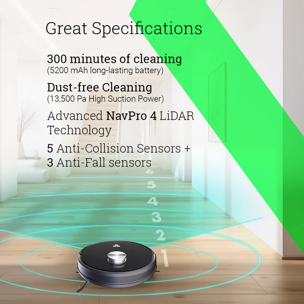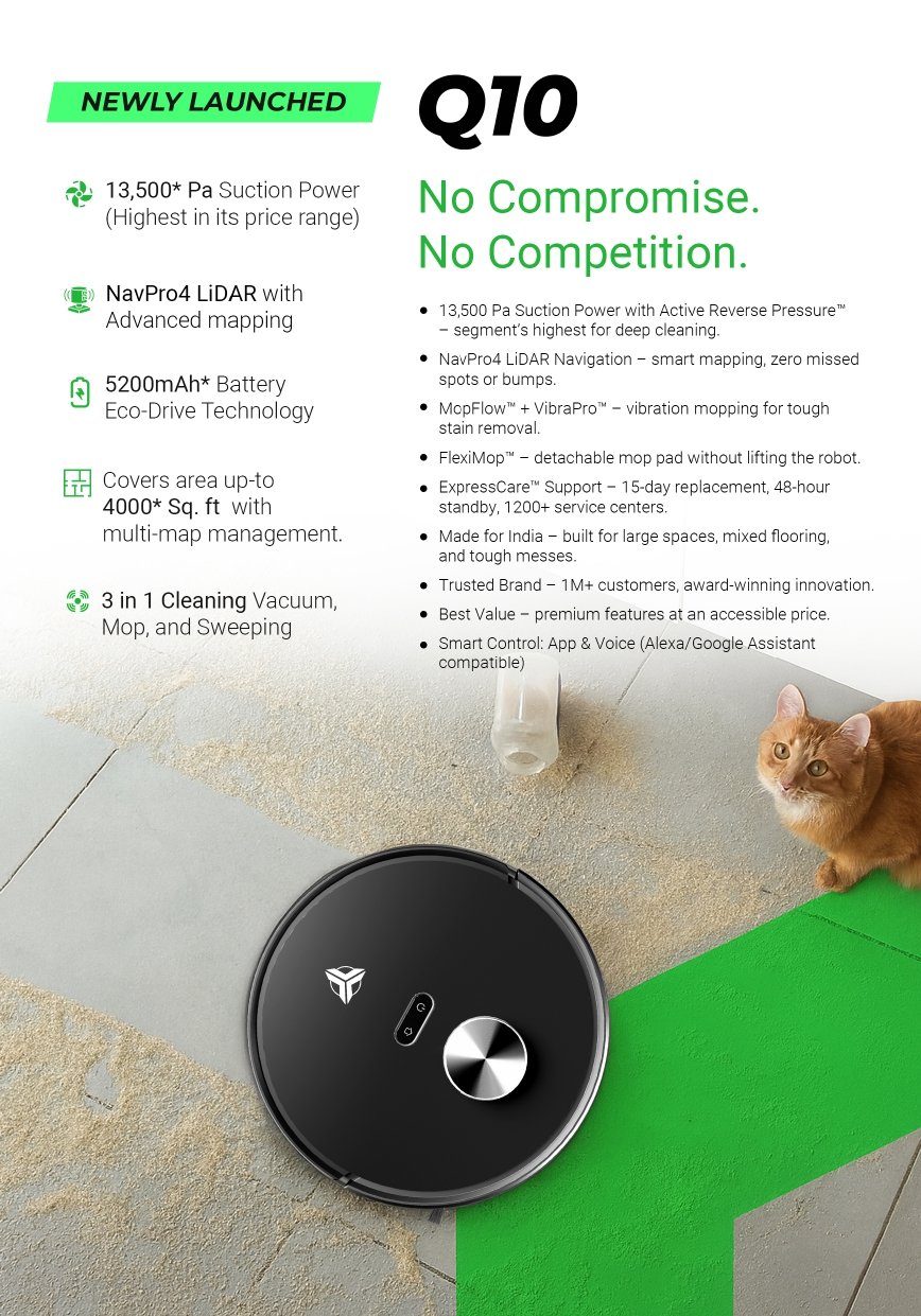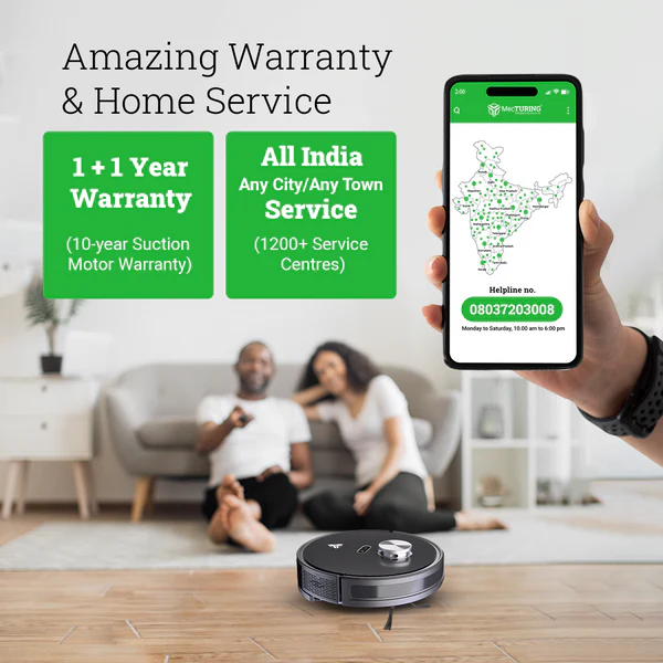 Engineered for Indian homes, the Q10 combines record-breaking 13,500 PA Active Reverse Pressure™ suction with advanced NavPro4 LiDAR navigation, ensuring every -corner of your home is spotless. Its Vibra-Pro™ Mopping Technology delivers deep, hygienic cleaning, while smart app and voice controls make operation effortless. Backed by MecTURING’s award-winning after-sales service and a 2-year warranty, the Q10 is the perfect blend of innovation, reliability, and value.